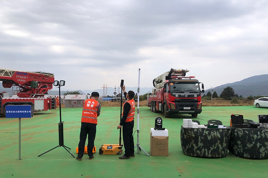 本次演習分指揮演習和綜合演習2個階段,設置43個演習科目。除地震救援中常規(guī)的搜救、轉運、安置科目外,還結合云南高山峽谷地區(qū)災害特點和高原環(huán)境實際,開展空地災情偵察、空地應急投送、空地聯(lián)合搜救、災區(qū)應急保障、次生災害處置等實戰(zhàn)化演習。尚為的特種應急照明設備、空中照明設備、便攜照明設備及參演人員的專業(yè)水平在各項目中充分展現,得到了有關領導的高度認可。